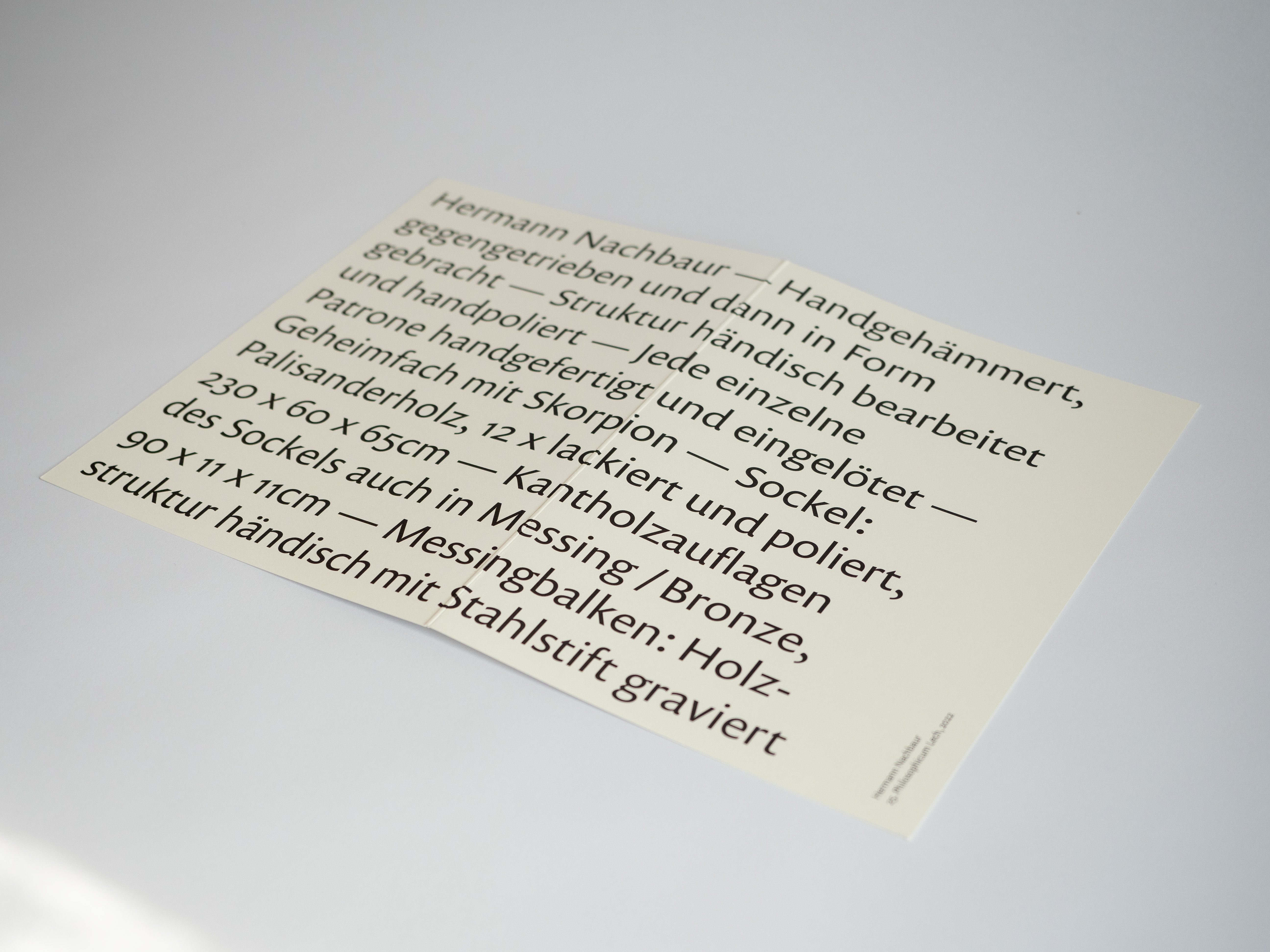 Ein eindrucksvoller Schaffensprozess bekommt gebührenden Raum auf dieser Klappkarte, die als erweiterte Visitenkarte und Begleitfolder, die Skulptur ergänzt. Die Gestaltung ist aufs Wesentliche reduziert, mit plakativer Typografie, die Grenzen überschreitet und Inhalten, die auf den Kopf gestellt, zum Perspektivenwechsel einladen.