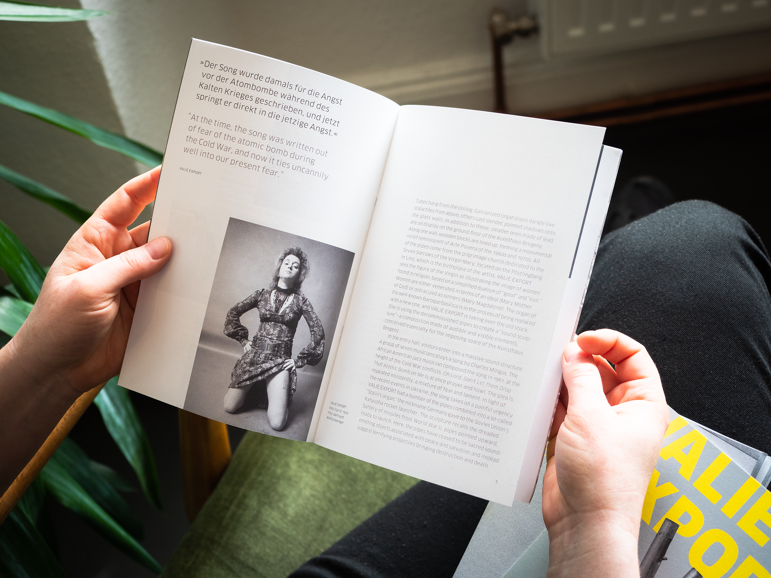 Das Plakatsujet reizt mit plakativer Typografie in knalligem Gelb – VALIE EXPORT in Versalien, ganz nach ihrem persönlichen, künstlerischen Credo. Die Welt auf den Kopf gestellt. Die Orgelpfeifen, ursprünglich als sakrale Klangkörper gesehen, werden nun zu bedrohlichen Geschossen. Das Sujet-Prinzip übersetzt die zwei konzeptionellen Laufrichtungen typografisch und bildlich.