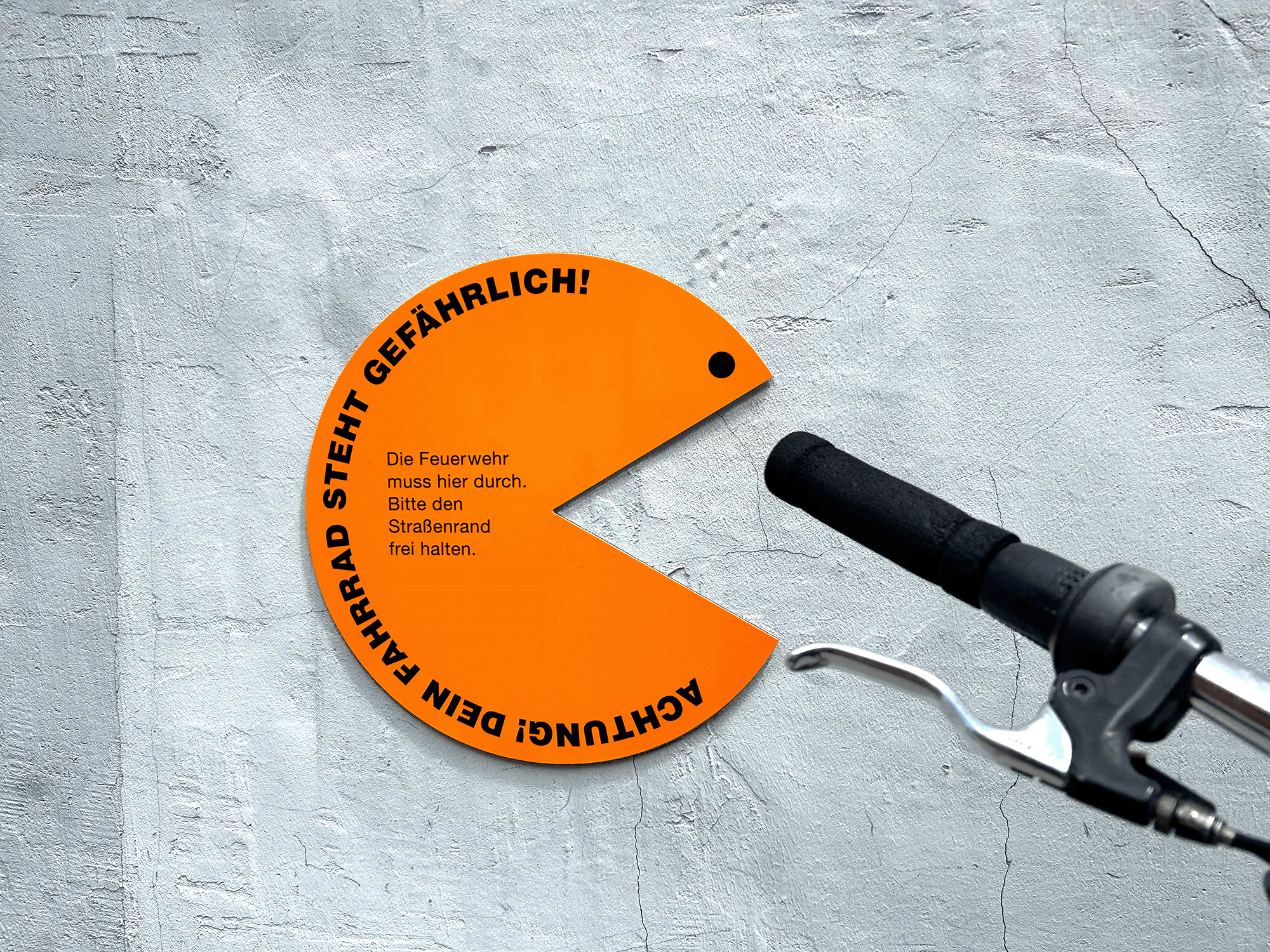 »Achtung, dein Fahrrad steht gefährlich! Denn … die Feuerwehr muss hier durch. Bitte den Straßenrand frei halten.«